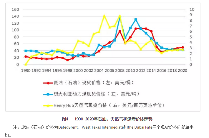 在能源價(jià)格中,油價(jià)具有典型的代表意義。一方面因?yàn)樵诒姸囝I(lǐng)域中用到的燃料和產(chǎn)品大多來自于石油。另一方面,煤炭的價(jià)格一直以來受到石油價(jià)格的直接影響,走勢大致相同;近幾年來,天然氣價(jià)格似乎已經(jīng)擺脫了隨油價(jià)而波動的趨勢(如圖4所示),然而與石油不同,天然氣尚未形成全球性的統(tǒng)一市場,北美、歐洲和亞太這三大天然氣市場氣價(jià)形成機(jī)制不同,導(dǎo)致價(jià)格存在明顯的差異(圖中采用的是北美HenryHub天然氣現(xiàn)貨價(jià)格,遠(yuǎn)低于亞洲LNG市場價(jià)格)。從石油價(jià)格來看,在1990年到2002年期間,石油價(jià)格相對平穩(wěn),基本維持在20美元/桶左右;從2003年到2008年,石油價(jià)格由28.9美元/桶飆升至97.0美元/桶;受2008年金融危機(jī)的影響,2009年石油價(jià)格達(dá)到局部最低點(diǎn),此后又開始回升,到2012年,達(dá)到歷史最高點(diǎn)-105.0美元/桶;2013年到2015年,石油價(jià)格由104.0美元/桶跌至50.8美元/桶,年均每桶下降26.6美元。煤炭的價(jià)格走勢基本與石油同步,在經(jīng)歷了2009年價(jià)格下跌之后,2011年又重新回到每噸130.1美元的價(jià)格高點(diǎn),之后一直到2015年,煤炭的價(jià)格不斷下跌。天然氣的價(jià)格在2012年短暫的擺脫了隨油價(jià)波動的趨勢,然而從2014年開始,又隨著石油價(jià)格的降低而降低。由此可見,當(dāng)前受全球能源供過于求的影響,能源價(jià)格持續(xù)低迷。
