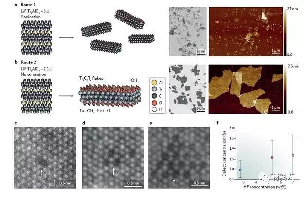 不同的制備條件會(huì)影響MXenes的性能、結(jié)晶度、缺陷和表面官能團(tuán),總的來(lái)說(shuō)較為溫和的刻蝕和單層剝落環(huán)境有利于大片層、少缺陷的MXenes的合成(圖3.a,b)。但在非常溫和環(huán)境下制備的Ti3C2Tx片層仍會(huì)有原子空位 (圖3.c-e), 空位的密集程度與刻蝕使用的 HF 濃度有很大聯(lián)系(圖3.f)。同樣的,刻蝕溫度和時(shí)間也會(huì)影響MXenes的層結(jié)構(gòu)和缺陷量。