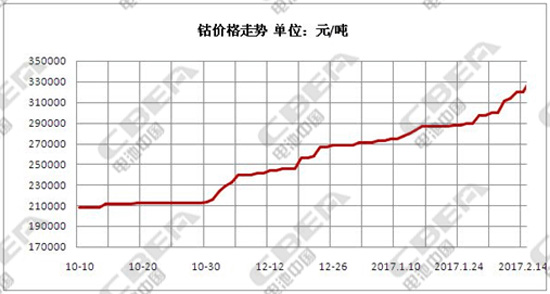 中國儲能網訊:今年以來,伴隨下游鈷需求上升以及補庫存需求,加之生產商的惜售情緒,鈷價出現(xiàn)了快速上漲,據中國有色金屬網統(tǒng)計,2017年2月22日,金屬鈷的參考價為37.7萬元/噸,四個月前的2016年10月22日,金屬鈷的報價在22萬元/噸左右,期間漲幅超過70%。今年2月1日,金屬鈷的價格為29.5萬元/噸,2月以來已上漲了約25%。