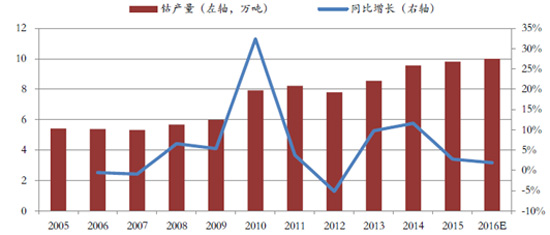 2016年全球鈷原料產量折合成金屬量約為10.1萬噸,同比增加3.5%。受銅鎳礦價格多年低迷的影響,鈷礦勘探及開發(fā)新增投入有限,再疊加鈷礦較為集中,剛果(金)占據資源的一半以上,政局動蕩以及童工手抓礦人權問題,導致2016年剛果產量下滑約10%,拖累全球鈷供給增長放緩。