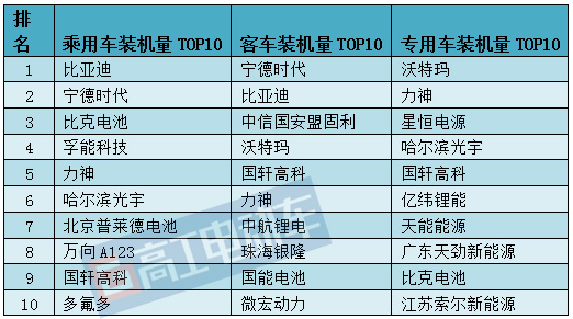 分領(lǐng)域看,在乘用車(chē)、客車(chē)和專(zhuān)用車(chē)領(lǐng)域裝機(jī)量居于首位的動(dòng)力電池企業(yè)分別為比亞迪、寧德時(shí)代與沃特瑪。此外,力神、星恒電源、中信國(guó)安盟固利、哈爾濱光宇、億緯鋰能、中航鋰電、國(guó)能電池、微宏動(dòng)力、廣東天勁、孚能科技、珠海銀隆、江蘇索爾、均等知名電池企業(yè)均憑借良好的成績(jī)出現(xiàn)在前十位的排名榜中。