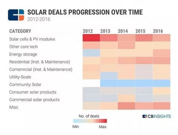 下面的熱力圖展示了2012至2016年間太陽能產(chǎn)業(yè)各個分領(lǐng)域的投資趨勢。