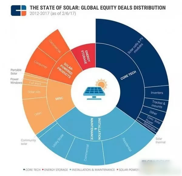 太陽能動力產(chǎn)品:包括消費(fèi)產(chǎn)品和商用產(chǎn)品兩類,在該領(lǐng)域有超過50筆投資交易。