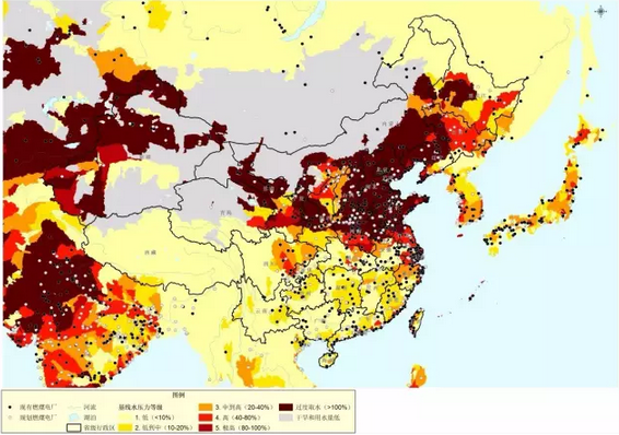 圖中不同顏色的地區(qū)表示不同的基線水壓力等級,棕色部分為“過度取水”(即基線水壓力等級大于100%)區(qū)域。黑色和白色圓點分別表示截至2013年底的全球已運行的燃煤電廠以及全球規(guī)劃和在建燃煤電廠