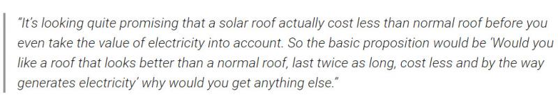 去年11月,在關(guān)于批準(zhǔn)特斯拉與Solarcity合并的特別股東會議上,特斯拉CEO Elon Musk首次提及,Solar Roof的產(chǎn)品成本可能低于傳統(tǒng)屋頂瓦片的成本,引發(fā)議論。這一說法也有悖于特斯拉之前的說法,在此之前,Musk與特斯拉高層關(guān)于Solar Roof的價格的表述為“考慮到后續(xù)的太陽能發(fā)電,它的整體價格實際上會低于傳統(tǒng)屋頂瓦片的價格。”特斯拉這樣把隨之帶來的電費節(jié)省也打包進(jìn)Solar Roof的價格中宣傳,無非是想盡力提升Solar Roof的產(chǎn)品競爭力。但Musk的新說法表明,情況發(fā)生了向特斯拉傾斜的變化。