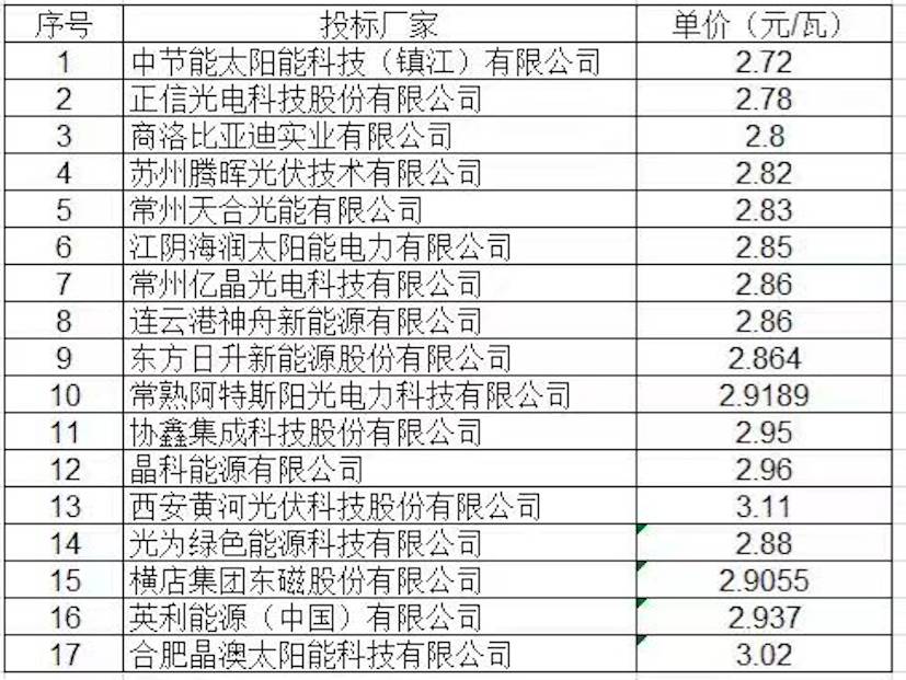 中國(guó)儲(chǔ)能網(wǎng)訊:近日,國(guó)電投公布了2017年度組件招標(biāo)價(jià)格情況。據(jù)悉,最低組件價(jià)格2.72元/W,最高3.11元。超過3元報(bào)價(jià)的企業(yè)只有2家。
