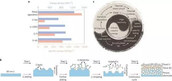 b.鋰剝離/電鍍過程的示意圖。步驟1:鋰電鍍使體積膨脹,SEI膜開裂;步驟2:機械電鍍使鋰枝晶從裂縫上生長;步驟3:鋰剝離導(dǎo)致孤立鋰的產(chǎn)生,體積變化使SEI進一步破裂;步驟4:不斷循環(huán),使1-3步反復(fù)發(fā)生,導(dǎo)致嚴(yán)重的安全問題和容量下降