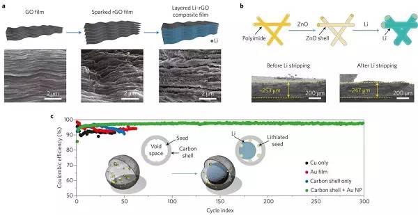 c.不同的電極在烷基碳酸鹽電解液中和0.5 mA cm?2電流密度下循環(huán)的庫倫效率以及金屬鋰膠囊的示意圖,金納米顆粒(Au NP)充當(dāng)鋰成核的晶種