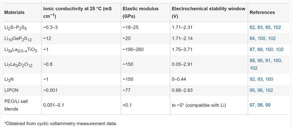 通常情況下,無機陶瓷具有較好的離子電導(dǎo)率和機械性能,Li10GeP2S12和Li9.54Si1.74P1.44S11.7Cl0.3的離子電導(dǎo)率(圖5a)甚至比液態(tài)電解質(zhì)還高(表1)。無機陶瓷的模量很高,足以阻止鋰枝晶的形成。但是必須在模量和表面粘附性之間取舍,模量高的粘附性則差。無機陶瓷的電化學(xué)窗口窄,循環(huán)的過程中還原反應(yīng)可能在電極/電解質(zhì)界面上發(fā)生從而形成鋰離子阻斷層,嚴(yán)重影響電池性能。