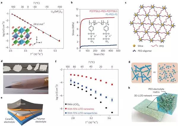 將固態(tài)聚合物電解質(zhì)與鋰離子電導(dǎo)率高的無機陶瓷結(jié)合是一種新的思路。將一個顆粒厚的Li1.6Al0.5Ti0.95Ta0.5(PO4)3與柔韌的聚合物結(jié)合,得到了靈活的且不產(chǎn)生枝晶的電解質(zhì)(圖5d)。最近,一種聚合物/陶瓷/聚合物三明治結(jié)構(gòu)被提出(圖5e)。在這種結(jié)構(gòu)下,Li1.3Al0.3Ti1.7(PO4)3(LATP)與聚(乙烯醇)甲基醚丙烯酸酯結(jié)合,既有柔軟的表面又有機械強度高的陶瓷體相。此外將一維Li3xLa2/3–xTiO3(LLTO)納米線與聚丙烯腈混合可以提供連續(xù)的鋰離子通道,室溫離子電導(dǎo)率可達0.1 mS cm-1(圖5f,g)。將石榴石相Li7La3Zr2O12(LLZO)納米線與聚環(huán)氧乙烯(PEO)結(jié)合也有類似的效應(yīng)。