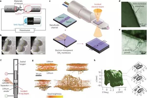 e.液體電池中原位TEM對鋰枝晶生長的觀察