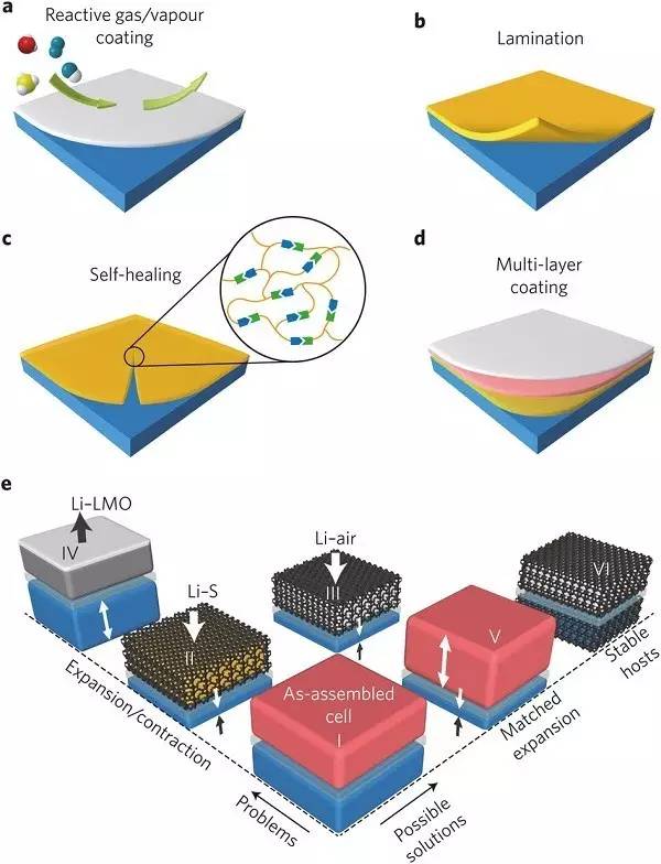 最近,在穩(wěn)定的主體材料納米尺度的間隙中注入鋰,得到了體積變化小的鋰負極。這種方法在Li-S和Li-空氣電池中非常重要。例如,通過鋰協(xié)同還原氧化石墨烯得到的分層的還原氧化石墨烯(圖4a)具有非常好的鋰潤濕性(親鋰性)。這種層狀的鋰/還原氧化石墨烯復(fù)合物使鋰負極的相對體積變化降低到20%,循環(huán)性能和安全性得到大幅提升。較好的親鋰性是主體材料的必要條件,然而與還原氧化石墨烯不同,大多數(shù)材料并不能被熔融鋰潤濕。在這種情況下,可以通過共形涂覆Si或ZnO薄膜來增強材料的親鋰性(圖4b)。這種效應(yīng)來源于Si或ZnO與熔融鋰的反應(yīng)在表面生成的親鋰物種(LixSi和LixZn/Li2O)。