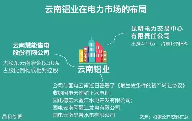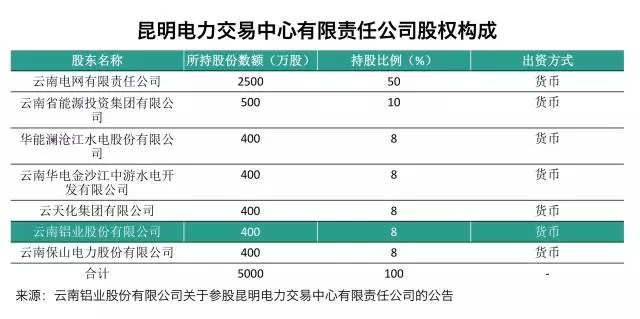 2016年11月18日,云南鋁業(yè)發(fā)布《關(guān)于參股昆明電力交易中心有限責(zé)任公司的公告》,稱為了加快實(shí)施“拓展兩頭、優(yōu)化中間”發(fā)展戰(zhàn)略,提升水電鋁加工一體化產(chǎn)業(yè)鏈的低成本能源優(yōu)勢(shì),完善市場(chǎng)化用電機(jī)制,“控制用電成本”,與云南電網(wǎng)有限公司等其他六家企業(yè)共同出資成立昆明電力交易中心有限公司,注冊(cè)資本5000萬元。