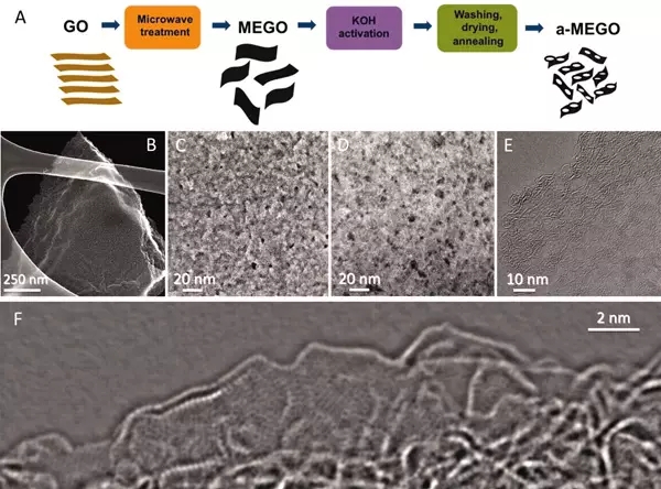 超級(jí)電容器在廣泛使用的過(guò)程中由于其低能量密度和相對(duì)較高的有效的串聯(lián)電阻而受到限制,使用電化學(xué)活化方法來(lái)剝離石墨烯,研究者們合成了一種比表面積高達(dá)3100m2/g的多孔碳,這種材料具有高的導(dǎo)電率和低的氧氫含量,靠sp2鍵結(jié)合的碳具有連續(xù)且高度彎曲的三維網(wǎng)狀結(jié)構(gòu),原子層墻最初的形成厚度為0.6-5納米寬度的孔隙,使用這種碳材料組裝的兩電極超級(jí)電容器有著高的質(zhì)量電容和高能量密度,而且文章中的方法甚至可以發(fā)展到產(chǎn)業(yè)化中。