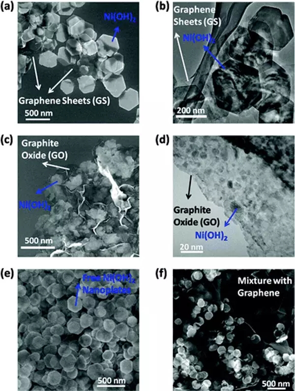 Ni(OH)2納米晶體上生長(zhǎng)不同氧化程度的石墨烯片層作為電化學(xué)贗電容材料是一種十分有潛力的儲(chǔ)能應(yīng)用材料。單晶Ni(OH)2六邊形納米片直接生長(zhǎng)在輕度氧化、表面導(dǎo)電的石墨烯片層上,復(fù)合材料顯示出高的比電容約為1335F/g和優(yōu)異的循環(huán)性能。高的比電容和快速的充放電能力很有前途應(yīng)用于能量密度和功率密度超高的超級(jí)電容器。預(yù)制備Ni(OH)2六邊形納米片和石墨烯進(jìn)行一個(gè)簡(jiǎn)單的物理混合顯示出較低的比電容,凸顯出直接在石墨烯納米材料的重要性,賦予了活性納米材料和導(dǎo)電石墨烯網(wǎng)絡(luò)之間緊密的相互作用和有效電荷傳輸。單晶Ni(OH)2六邊形納米片直接生長(zhǎng)在石墨烯片層上的性能要優(yōu)于在小的Ni(OH)2納米顆粒上生長(zhǎng)高度氧化的、電絕緣的網(wǎng)狀石墨烯。