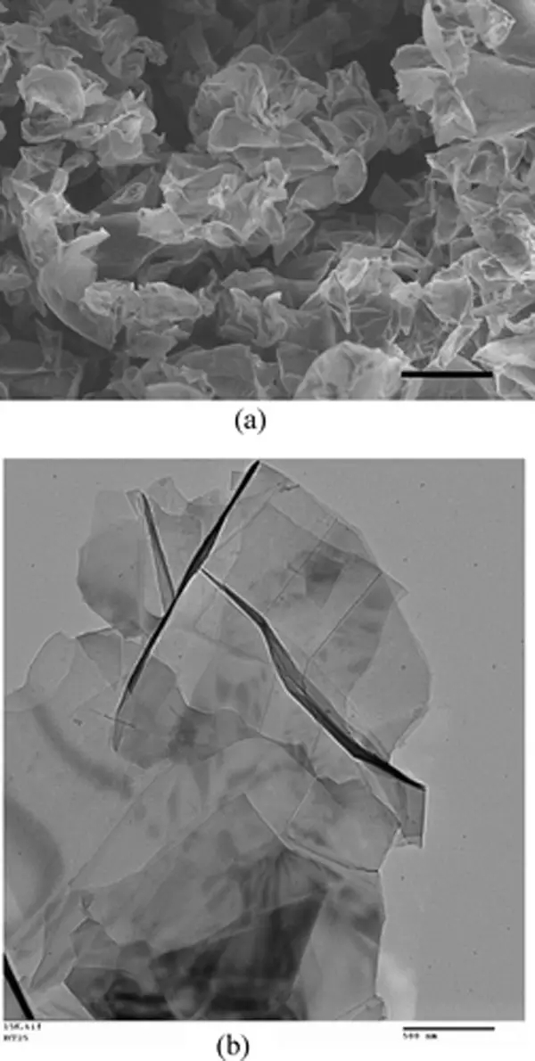 圖5 彎曲的石墨烯片層的SEM和TEM圖片