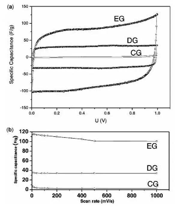 此后,以石墨烯為核心的儲(chǔ)能材料在超級(jí)容器中的研究迅速發(fā)展起來(lái)。單個(gè)石墨烯片的比表面積可達(dá)2630 m2 / g,這個(gè)值遠(yuǎn)遠(yuǎn)大于現(xiàn)在使用活性炭做電極材料的電化學(xué)雙電層電容器。Stoller等人以水合肼作為還原劑,在100 °C的油浴中將石墨烯氧化(Graphene Oxide, GO)還原成石墨烯,雖然具有一定程度的團(tuán)聚,但其比表面可達(dá)705 m2/g,在KOH電解質(zhì)中其比容量為135 F/g,在TEABF4 /AN電解質(zhì)中比電容為99 F/g,但水合肼毒性較大。Stoller等人的研究團(tuán)隊(duì)開(kāi)創(chuàng)了一種新的碳材料,稱之為化學(xué)改性石墨烯(CMG)。CMG材料來(lái)源于一個(gè)原子層厚的碳片,根據(jù)所需功能化,研究者們研究了該材料在超級(jí)電容器中的性能。此外,高導(dǎo)電性使這些材料在一個(gè)廣泛的電壓窗口內(nèi)有良好的性能。