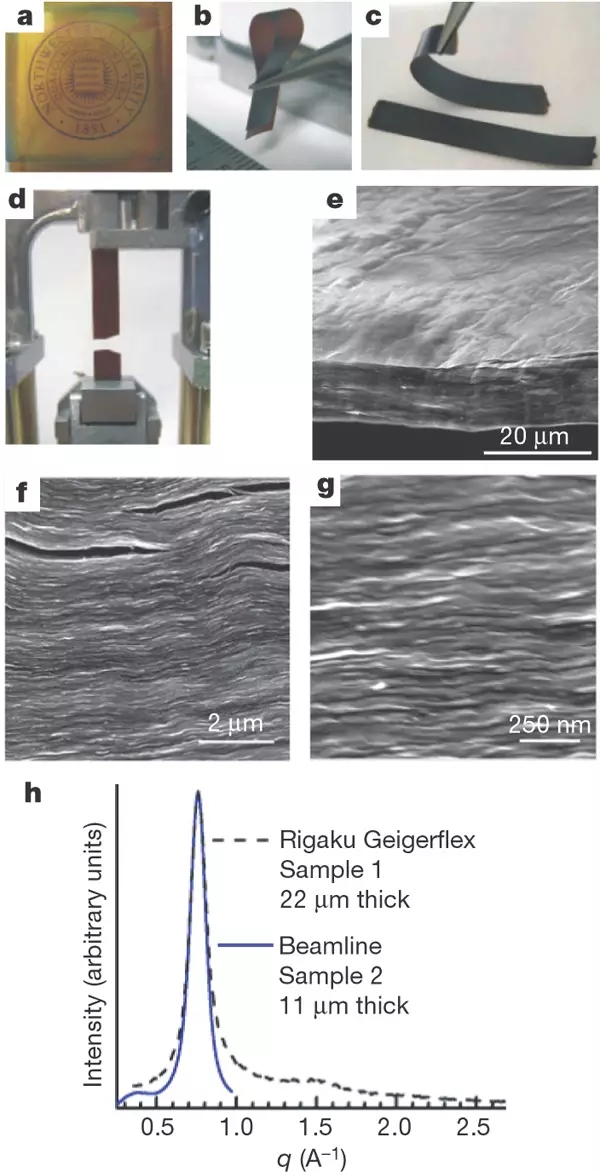 自支撐的紙型和薄膜型材料已經(jīng)是當(dāng)今社會(huì)技術(shù)中的一部分,它們可以應(yīng)用在保護(hù)圈、化學(xué)濾器、電池和超級(jí)電容器的組分、粘結(jié)層以及分子存儲(chǔ)等方面,納米級(jí)的無(wú)機(jī)紙型材料(比如剝離的蛭石和云母板)已經(jīng)受到很多關(guān)注,而且已經(jīng)作為保護(hù)涂料、高溫粘結(jié)劑、介質(zhì)阻擋和氣體防滲膜等材料商業(yè)化。來(lái)源于巴奇紙的碳納米管顯示出優(yōu)異的機(jī)械和電子性能,使它可能應(yīng)用于燃料電池和結(jié)構(gòu)復(fù)合物。文章報(bào)道了一種氧化石墨烯紙的制備和表征,這種氧化石墨烯紙是單個(gè)氧化石墨烯片層定流控制制備的碳基膜材料。這種新型材料在剛度和強(qiáng)度上超過(guò)其他很多紙型材料,這種材料結(jié)合了宏觀上剛性和柔性兩種優(yōu)點(diǎn),紙型的片層之間有很大的表面相互作用力,其褶皺也處于原子級(jí)別,褶皺形態(tài)處于亞微米級(jí)別,這些條件使材料的宏觀樣品具有高效的載荷分布,也使材料相比于傳統(tǒng)的碳基、黏土基紙更有彈性。類似于氧化石墨烯的廉價(jià)原始材料促進(jìn)了大面積紙型片層的制備,同時(shí)可以應(yīng)用于可控滲透過(guò)濾膜、各向異性離子導(dǎo)體、超級(jí)電容器、分子儲(chǔ)存材料等。石墨烯氧化紙也可以摻雜或作為物質(zhì)載體制備含有聚合物、陶瓷和金屬的混合材料。另外,分層的氧化石墨烯片層表面有許多化學(xué)官能團(tuán)使材料具有更多功能。
