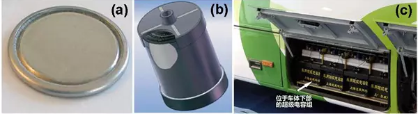 圖1 商業(yè)超級(jí)電容器實(shí)物圖(a, b),混合動(dòng)力汽車中的超級(jí)電容器電源(c)