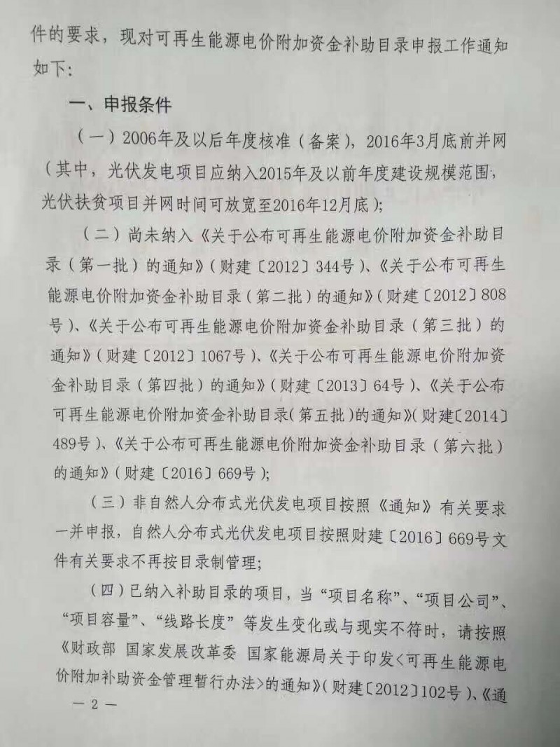 根據(jù)《財(cái)政部 國(guó)家發(fā)展改革委 國(guó)家能源局關(guān)于印發(fā)<可再生能源電價(jià)附加補(bǔ)助資金管理暫行辦法>的通知》(財(cái)建﹝2012﹞102號(hào))、《財(cái)政部關(guān)于分布式光伏發(fā)電實(shí)行按照電量補(bǔ)貼政策等有關(guān)問(wèn)題的通知》(財(cái)建〔2013〕390號(hào),以下簡(jiǎn)稱《通知》)等有關(guān)文件的要求,現(xiàn)對(duì)可再生能源電價(jià)附加資金補(bǔ)助目錄申報(bào)工作通知如下: