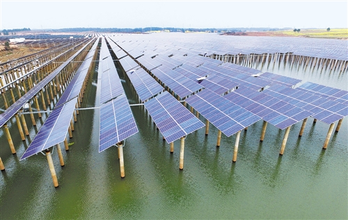 這是3月16日拍攝的江西奉新“漁光互補(bǔ)”光伏發(fā)電一期項目。近日,坐落于江西省宜春市奉新縣躍進(jìn)水庫上的泰明“漁光互補(bǔ)”光伏發(fā)電項目一期35兆瓦光伏電站建成投運(yùn)。該項目總投資12億元,總裝機(jī)容量110兆瓦,上層用于光伏發(fā)電,下層用于水產(chǎn)養(yǎng)殖,提高了單位面積土地和水域的經(jīng)濟(jì)價值。新華社記者 萬象 攝
