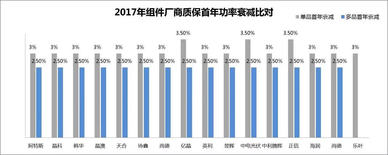 多晶和單晶組件光致衰減差異的另一個佐證是組件質(zhì)保第一年的衰減率。從下圖可以看出,國內(nèi)各廠對多晶組件的質(zhì)保首年衰減均為2.5%,而單晶為3-3.5%,兩者差別為0.5-1%,與大量電站發(fā)電的實際測試數(shù)據(jù)基本吻合。