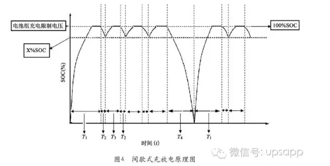 由于鈦酸鋰電池的電解液是有機(jī)液體,再加上鋰金屬是一種非?;顫姷脑?所以該電池必須密封,電池在正常的充放電條件下是幾乎不產(chǎn)生氣體的。即使電池長期處于間歇充電狀態(tài)下,電池內(nèi)部也不會產(chǎn)生較高壓力,電池安全可靠。另外,通信基站電源對電池組的供電方式是浮充加均充穩(wěn)壓限流工作模式,對于電池組間歇充電而言,調(diào)整浮充和均充電壓,都設(shè)定為53.9V,對鈦酸鋰電池組進(jìn)行充電,這個(gè)電壓對電池極板和電解液都是比較穩(wěn)定的,電池容量變化極小,不同的浮充電壓值對電池的容量影響不明顯,電池可以長期處于間歇式充、放電狀態(tài),所以鈦酸鋰電池組用于通信基站是非常適合的。圖4為間歇式充放電原理圖。
