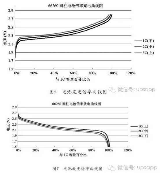 圖6和圖7以66260圓柱型鈦酸鋰電池為例,分別給出了電池充、放電倍率曲線圖。