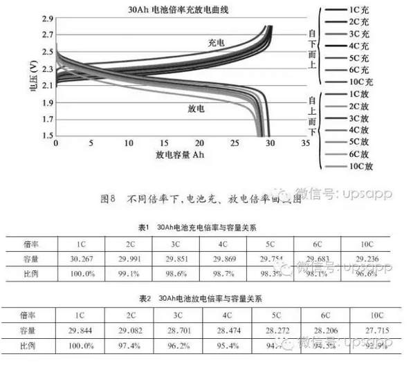 圖8是30Ah電池在不同倍率下的充、放電倍率曲線圖。具體數(shù)據(jù)見表1和表2。