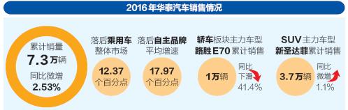 根據(jù)乘聯(lián)會(huì)數(shù)據(jù)顯示,去年華泰汽車的累計(jì)銷量為7.3萬輛,同比微增2.53%,落后乘用車整體市場(chǎng)12.37個(gè)百分點(diǎn),落后自主品牌平均增速17.97個(gè)百分點(diǎn)。