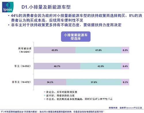 益普索(Ipsos)數(shù)據(jù)顯示,44%的消費(fèi)者會(huì)因?yàn)檎畬π∨帕啃履茉窜囆偷姆龀终叨x擇購買,8%的消費(fèi)者認(rèn)為購買成本高,后續(xù)用車便利性不足;非車主對于扶持政策更多持有不確定態(tài)度,要依據(jù)扶持力度而決定。