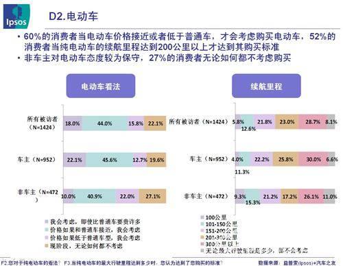 對于電動(dòng)車,60%的益普索(Ipsos)被訪者表示,當(dāng)電動(dòng)車價(jià)格接近或者低于普通車,才會(huì)考慮購買電動(dòng)車,52%的消費(fèi)者當(dāng)純電動(dòng)車的續(xù)航里程達(dá)到200公里以上才達(dá)到其購買標(biāo)準(zhǔn);非車主對電動(dòng)車態(tài)度較為保守,27%的消費(fèi)者無論如何都不考慮購買。