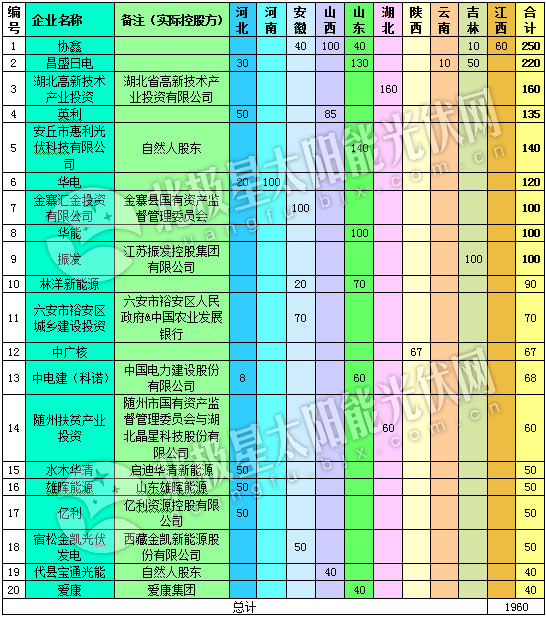 下表為獲得集中式地面電站扶貧指標(biāo)的Top20企業(yè)統(tǒng)計(jì)