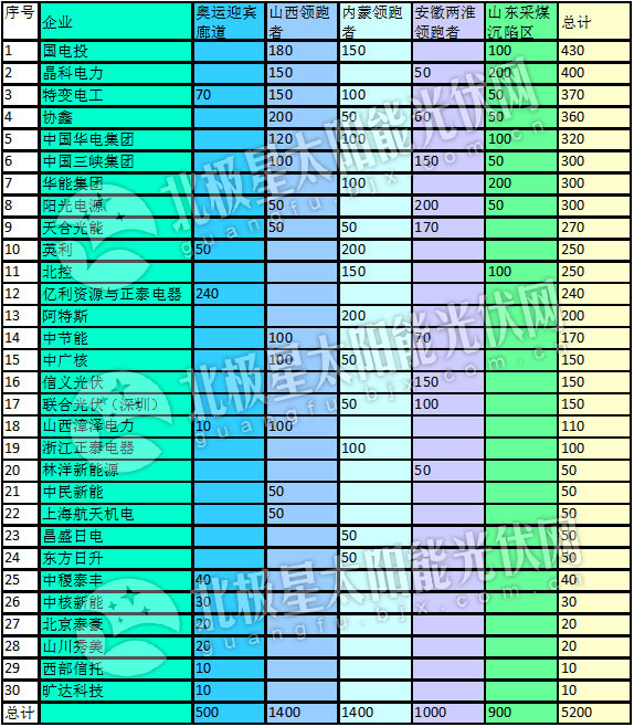 下表格為各企業(yè)所獲指標(biāo)的容量以及排名