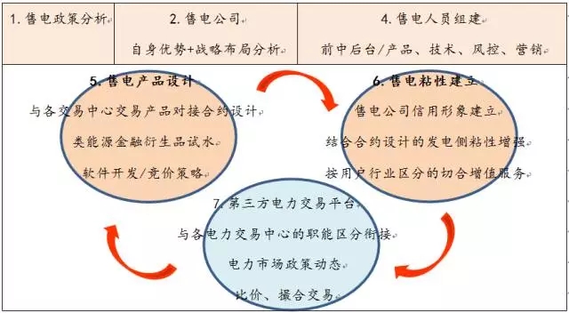 目前感受到大家普遍關(guān)心的售電事業(yè)重心一是在于基于信息滯后不對(duì)等或者所處地區(qū)行業(yè)不同造成的對(duì)不同準(zhǔn)入或者流程不明問(wèn)題,二是各大用戶直接交易或售電可參與交易地區(qū)的競(jìng)價(jià)策略。一時(shí)間,相關(guān)衍生出的各種政策咨詢,售電增值服務(wù),售電內(nèi)部軟件開(kāi)發(fā),售電第三方交易平臺(tái)平行開(kāi)花??上跎俑惺艿秸娴目梢园央姰?dāng)作“商品”來(lái)做售電公司。心中的售電如圖是各環(huán)相互銜接相互影響支撐的,具體還需根據(jù)個(gè)售電公司成立背景初衷來(lái)做分析