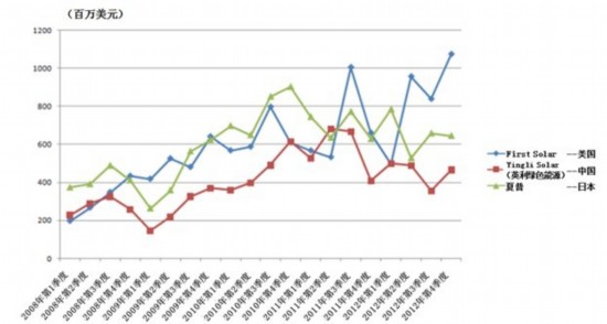 但是,夏普和中國英利太陽能自2011年開始,銷售額突然呈下跌趨勢。為了比較三家企業(yè)的銷售額,夏普的銷售額根據(jù)各季度末的匯率換算成了美元,因此,還受到了一些匯率影響。但其實(shí)即使按照日元計(jì)算,得到的結(jié)論也基本和上述到2010年為止的銷售額增長趨勢以及2011年之后的下降趨勢一樣。