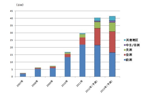 注:2013年歐洲市場大幅下跌,相反,亞洲和美洲市場有所增長。由于該數(shù)據(jù)為2012年5月公布,因此2012年的數(shù)值為預(yù)測值。