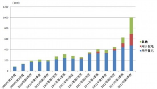 而亞洲和美洲則代替歐洲市場,出現(xiàn)了新的增長。亞洲市場的增長主要依賴于中國、日本、印度這三大市場。2012年7月,日本開始實(shí)施可再生能源固定價格收購制度,太陽能面板的需求急速增加。日本國內(nèi)的太陽能發(fā)電面板的出貨量,在2012年第4季度首次達(dá)到了1GW(圖2)。其中,約一半用于住宅,而包括巨型太陽能在內(nèi)的用于發(fā)電業(yè)務(wù)的則占整體的20%以上。