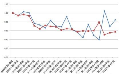 注:根據(jù)First Solar和夏普各季度的出貨量以及銷售額計(jì)算得出。以2008年第1季度的值為1。藍(lán)色代表First Solar,紅色代表夏普