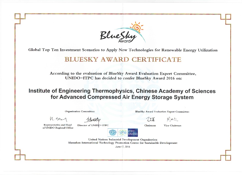 2016年6月17日,葛洲壩儲能先進(jìn)壓縮空氣儲能技術(shù)榮獲“2016全球可再生能源領(lǐng)域最具投資價值的領(lǐng)先技術(shù)藍(lán)天獎”?!八{(lán)天獎”是由聯(lián)合國工業(yè)發(fā)展組織、中國可再生能源學(xué)會等共同主辦,聯(lián)合國工業(yè)發(fā)展組織深圳國際能源與環(huán)境技術(shù)促進(jìn)中心組織實施的一項國際獎項評選活動,每年“藍(lán)天獎”評選不多于10項獲獎技術(shù)。評選出的獲獎技術(shù)均得到了有效的產(chǎn)業(yè)化推廣應(yīng)用,對倡導(dǎo)和推動潔凈可再生能源的使用,促成可再生能源領(lǐng)域新技術(shù)開發(fā)與產(chǎn)業(yè)化投資的緊密結(jié)合,探尋可再生能源的規(guī)?;l(fā)展產(chǎn)生了積極深遠(yuǎn)的影響。