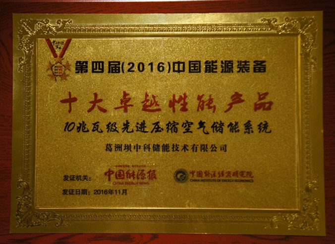 2016年11月30日,由葛洲壩儲能開發(fā)和實施產(chǎn)業(yè)化的10MW級先進(jìn)壓縮空氣儲能系統(tǒng),在國際清潔能源論壇上榮獲“第四屆(2016)中國能源裝備十大卓越性能產(chǎn)品”榮譽。評委會提出的獲獎理由為:該系統(tǒng),擺脫了傳統(tǒng)壓縮空氣儲能系統(tǒng)依賴大型儲氣室和化石燃料、系統(tǒng)損失大效率低的科技問題,是國內(nèi)最大、國際領(lǐng)先的壓縮空氣儲能系統(tǒng),具有成本低、壽命長、效率高、不受地理條件限制、對環(huán)境友好、安全性好等優(yōu)點,通過該系統(tǒng)的調(diào)峰調(diào)頻、削峰填谷、平衡負(fù)荷等作用,滿足了可再生能源電力的大規(guī)模接入并網(wǎng)的要求,并可作為區(qū)域能源系統(tǒng)負(fù)荷平衡裝置和備用電源,與風(fēng)、光形成互補,極大的提高可再生能源應(yīng)用比例,達(dá)到節(jié)能減排之目的。