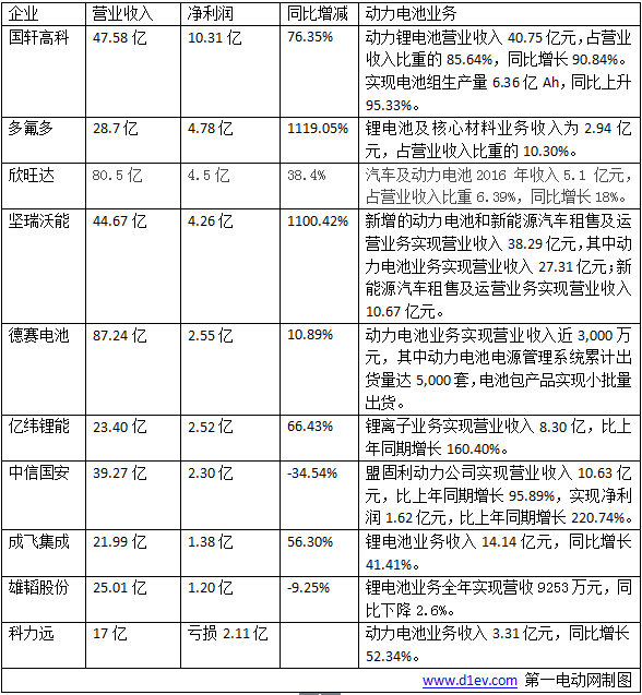中國儲能網(wǎng)訊:近日,國軒高科、多氟多、欣旺達(dá)、德賽電池、億緯鋰能、中信國安、成飛集成、雄韜股份、科力遠(yuǎn)等10家涉足動力電池業(yè)務(wù)的上市公司2016年報陸續(xù)發(fā)布。