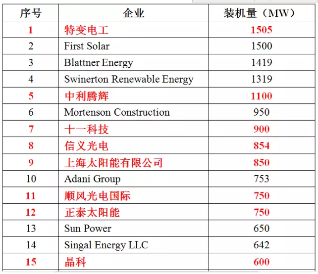 得益于2016年中國(guó)新增裝機(jī)35.54GW,約占世界總裝機(jī)的47%。因此,全球EPC企業(yè)30強(qiáng)中,包含13家中國(guó)企業(yè),2016年的EPC工程總規(guī)模在350MW~1505MW,它們2016年具體的業(yè)績(jī)?nèi)缦卤硭尽?