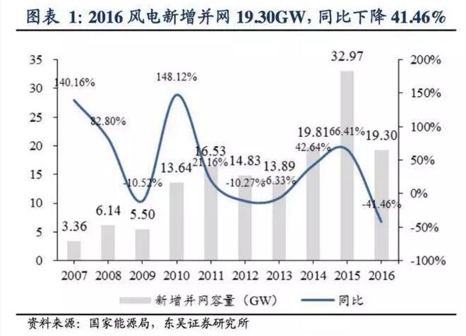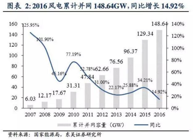 新增并網(wǎng)裝機19.30GW,同比下降 41.46%:2017年1月26日,國 家能源局發(fā)布2016年風電并網(wǎng)運行情況。2016年全年新增風電裝機19.30GW,同比下降41.46%;累計并網(wǎng)裝機達到148.64GW,同比增長14.92%。2016 年是我國風電開發(fā)往東部、南部轉移的突破之年,風電布局進一步優(yōu)化。受南方施工條件復雜以及夏季雨季、汛期的影響,施工周期拉長,并網(wǎng)進度延緩。