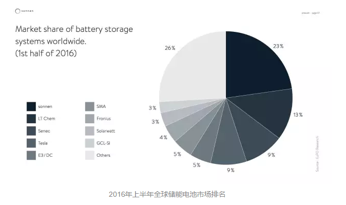 根據(jù)統(tǒng)計,截至2016年上半年,sonnen在全球儲能電池市場份額中高居首位,市場比例達到23%。