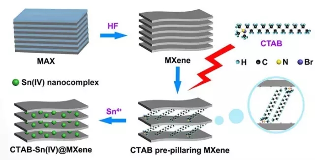 中國儲能網(wǎng)訊:二維MXene是一類二維過渡金屬碳/氮化物晶體材料。作為新型二維材料,現(xiàn)已經(jīng)廣泛應(yīng)用于超級電容器、鋰離子電池、儲氫、污水凈化、光催化等領(lǐng)域。雖然MXene材料在電化學(xué)儲能領(lǐng)域具有良好性能,但是其層間儲能空間尚未完全開發(fā)利用。那么,有沒有可能使用一些新方法,使MXene的層間域進一步增大,且達到可控,從而進一步有效利用其儲能空間?近日,浙江工業(yè)大學(xué)陶新永教授團隊利用陽離子表面活性劑、金屬錫離子等對MXene進行預(yù)柱撐和柱撐處理,制備了一種新型高性能的“柱撐結(jié)構(gòu)”MXene材料,并成功用于鋰離子電容器。