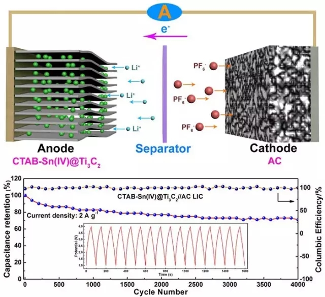 鋰離子電容器是介于鋰離子電池與超級電容器之間的一種電化學(xué)儲能器件,同時兼具超級電容器的高功率密度以及鋰離子電池高能量密度等特點。目前鋰離子電容器負極材料主要是一些嵌入型材料(如TiO2-B、Li4TiO12等)。然而,嵌入型負極材料因其較低的容量以及較差的倍率性能已不能滿足高能量密度、高功率密度鋰離子電容器的需求。二維MXene材料因其高電導(dǎo)率、低鋰離子擴散能壘等優(yōu)點,在鋰離子電容器中展現(xiàn)出良好的應(yīng)用前景,但受制于層間域有限,其儲鋰容量尚需改善。