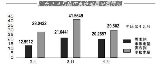 新規(guī)則約束了申報(bào)電量對成交價(jià)差的影響,也對電量供需比例做出了調(diào)整。廣東3月參與競價(jià)的電量供需比為2:1,2月則為2.16:1,而4月競價(jià)的供需比被調(diào)整為1.5:1,從參與競爭的電量上緩和了供需矛盾。4月集中競價(jià)中,供應(yīng)側(cè)總申報(bào)電量為295020.3萬千瓦時(shí),需求側(cè)總申報(bào)電量202656.9萬千瓦時(shí)。