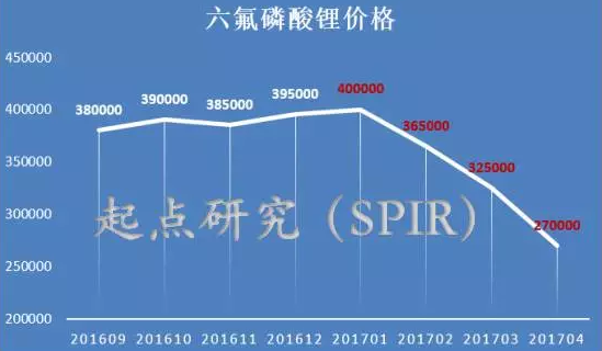 據起點研究(SPIR)分析師王前進指出,作為鋰電池電解液核心材料,春節(jié)前六氟磷酸鋰價格漲勢兇猛,春節(jié)后由于受新能源汽車補貼政策影響,電池企業(yè)在產能擴張上持保守態(tài)度,產能釋放有限,上游需求不足使得六氟磷酸鋰價格逐漸回調。而在上游需求不足與下游產能釋放之間的博弈過程中,六氟磷酸鋰價格從高位下跌到25-30萬元/噸左右。4月六氟磷酸鋰價格趨于穩(wěn)定,在當前范圍內徘徊,未來隨著六氟磷酸鋰企業(yè)產能的釋放及電池企業(yè)降成本的要求,六氟磷酸鋰價格未來仍會有所下調,但下調幅度將會放緩。