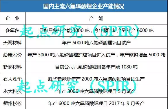 自2016年開始,多氟多、天賜材料、必康股份等國內主流六氟磷酸鋰企業(yè)紛紛擴大產能,因此起點研究(SPIR)對目前國內主流六氟磷酸鋰企業(yè)產能情況進行專門的統(tǒng)計,如下表: